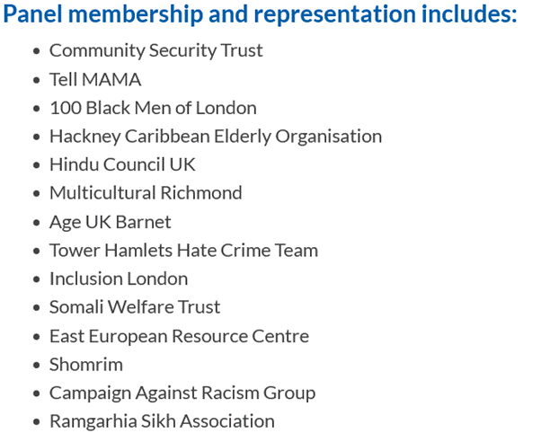 Scanning down the list, we find that the Met is lobbied to pay attention to hate crime by groups purporting to speak for Jews (Community Security Trust and Shomrim), Muslims (Tell MAMA), black men, elderly Caribbeans, Hindus, old people, deaf and disabled people (Inclusion London), Somalis, Eastern Europeans, East Asians (Campaign Against Racism Group) and Sikhs (plus Multicultural Richmond, whose focus is “ethnic minority communities”, and the hate crime team of Tower Hamlets, a borough which, notes one writer in the Critic, “is under the full political control of an exclusively Bangladeshi-Islamic male-only political party”). Most of these of course receive significant state funding. Conspicuous by its absence is any group which claims to speak for white British people or for Christians (both also demographic minorities in London, lest we forget). The composition of other panels is less easy to come by (I have sent an FOI), but I’m willing to bet they look pretty similar.